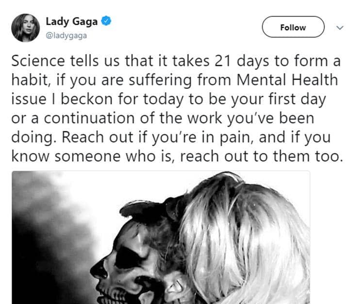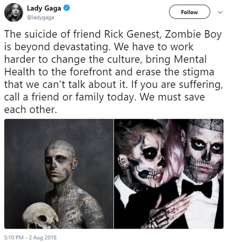 Pelantun lagu Bad Romance tersebut menulis dalam akun Twitternya, “Kabar bunuh diri seorang teman yaitu Rick Genest, Zombie Boy, begitu menyedihkan. Kita perlu bekerja lebih keras untuk mengubah budaya, membawa kesehatan mental ke permukaan dan menghapus stigma bahwa kita nggak bisa membicarakannya. Jika kamu mengalaminya, hubungi teman atau keluarga hari ini. Kita harus menyelamatkan satu sama lain.” Nggak hanya itu, Gaga juga mengajak follower-nya untuk lebih sadar dan peduli dengan isu kesehatan mental.